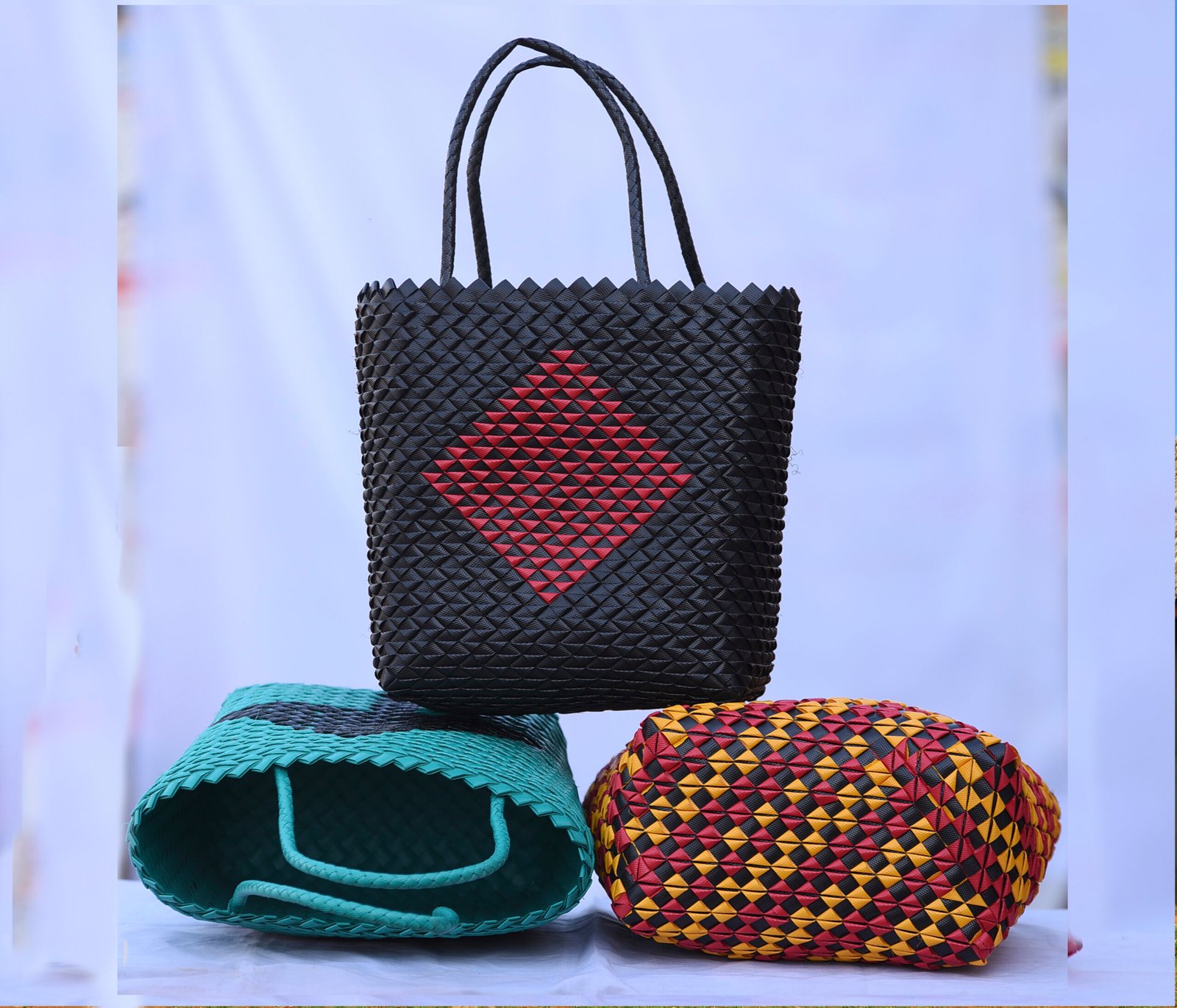 A bold, handcrafted tote bag made from recycled plastic, featuring a striking red geometric pattern on a black base. Durable, lightweight, and eco-conscious perfect for everyday use.