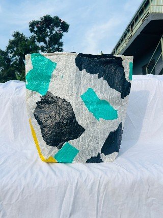 This upcycled shopping bag is thoughtfully handcrafted from recycled plastic waste, giving discarded materials a new life as a functional and stylish everyday essential. The bag features a striking abstract patchwork design with contrasting tones that make each piece visually unique.